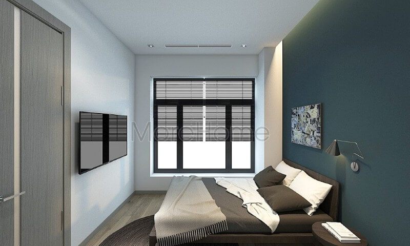 Để tạo điểm nhấn ấn tượng cho không gian phòng ngủ nhỏ, bố trí nội thất đơn giản và dán giấy dán tường màu xanh lạ mắt lên phần vách tường đầu giường.